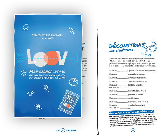 Destiné aux filles et aux garçons de 9 à 12 ans, LOOV est à la fois un livre et un carnet où les préados peuvent consigner leurs expériences et chercher des réponses à leurs interrogations sur la sexualité, l’identité, l’amour et l’intimité. Ils y trouveront, entre autres :